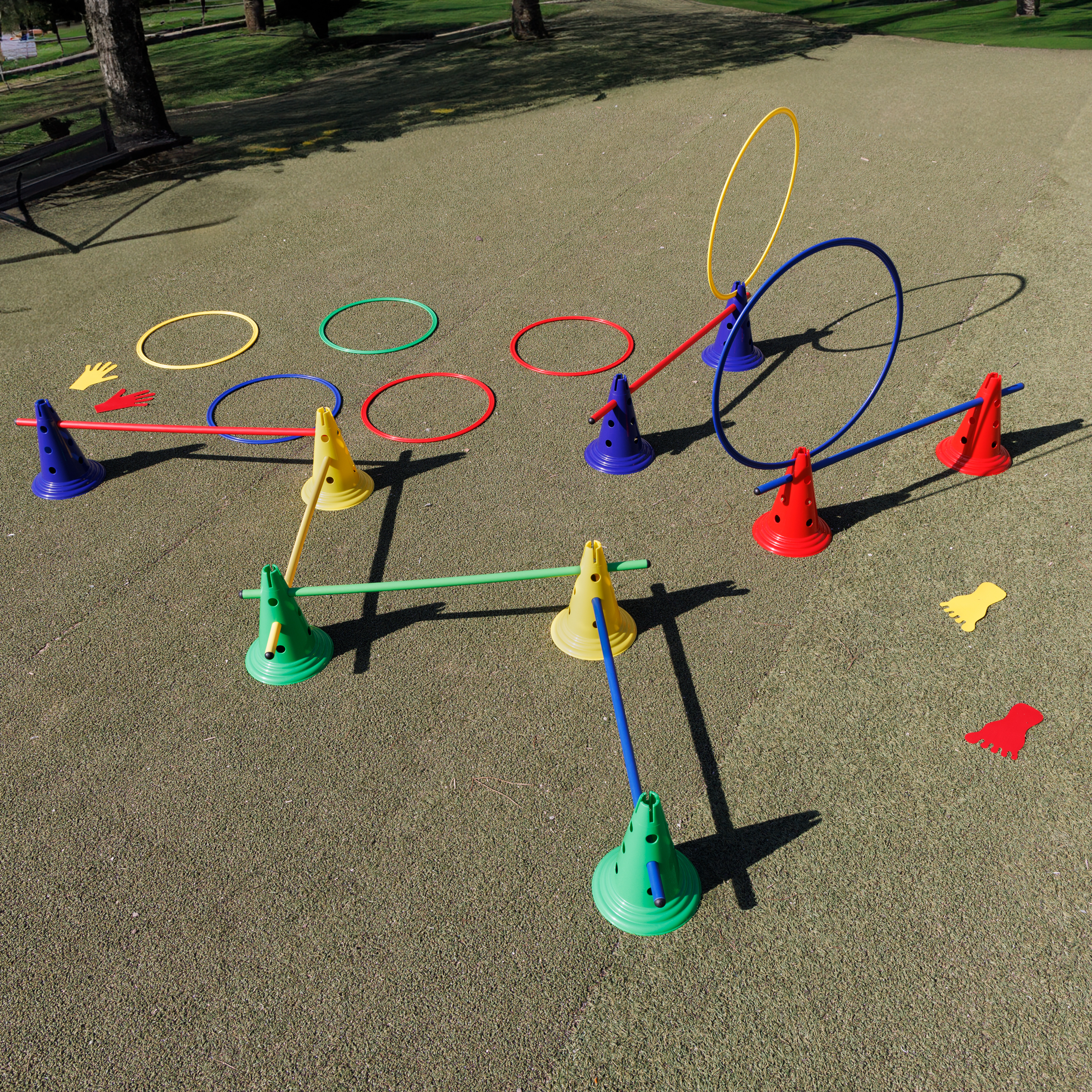 Motor skills activity set for coordination and balance, suitable for various age groups and designed to create different levels of difficulty.