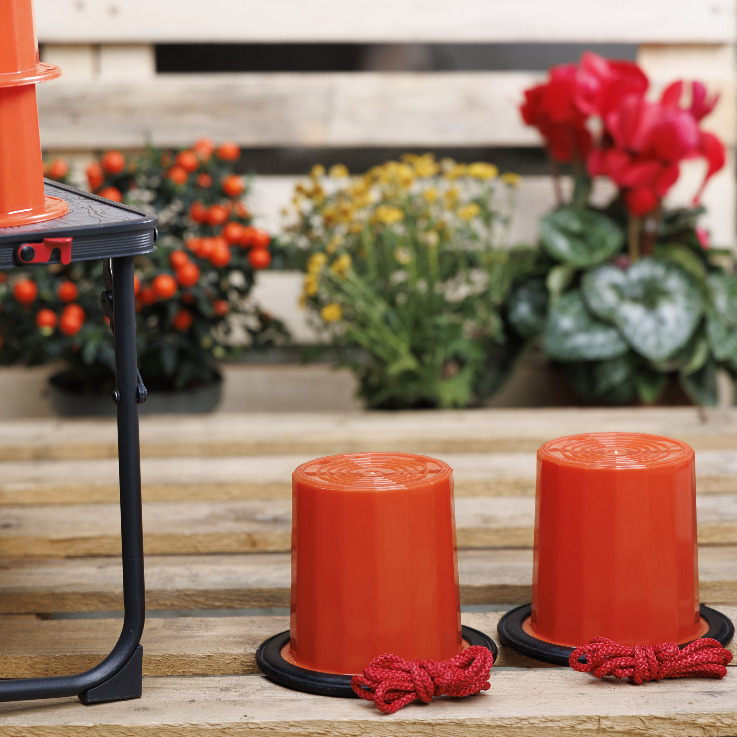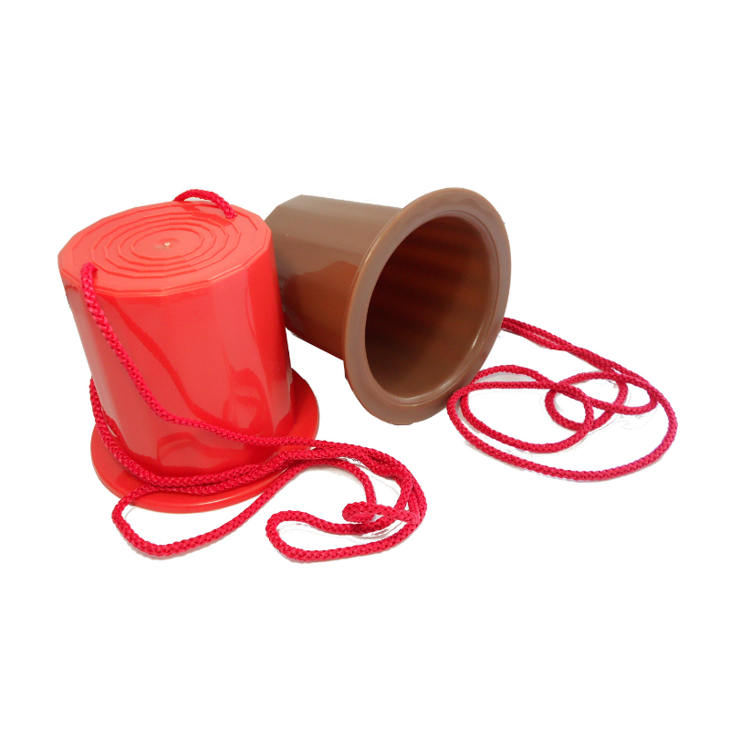 Pair of sustainable plastic balancing stilts for children with rope and non-slip inserts.